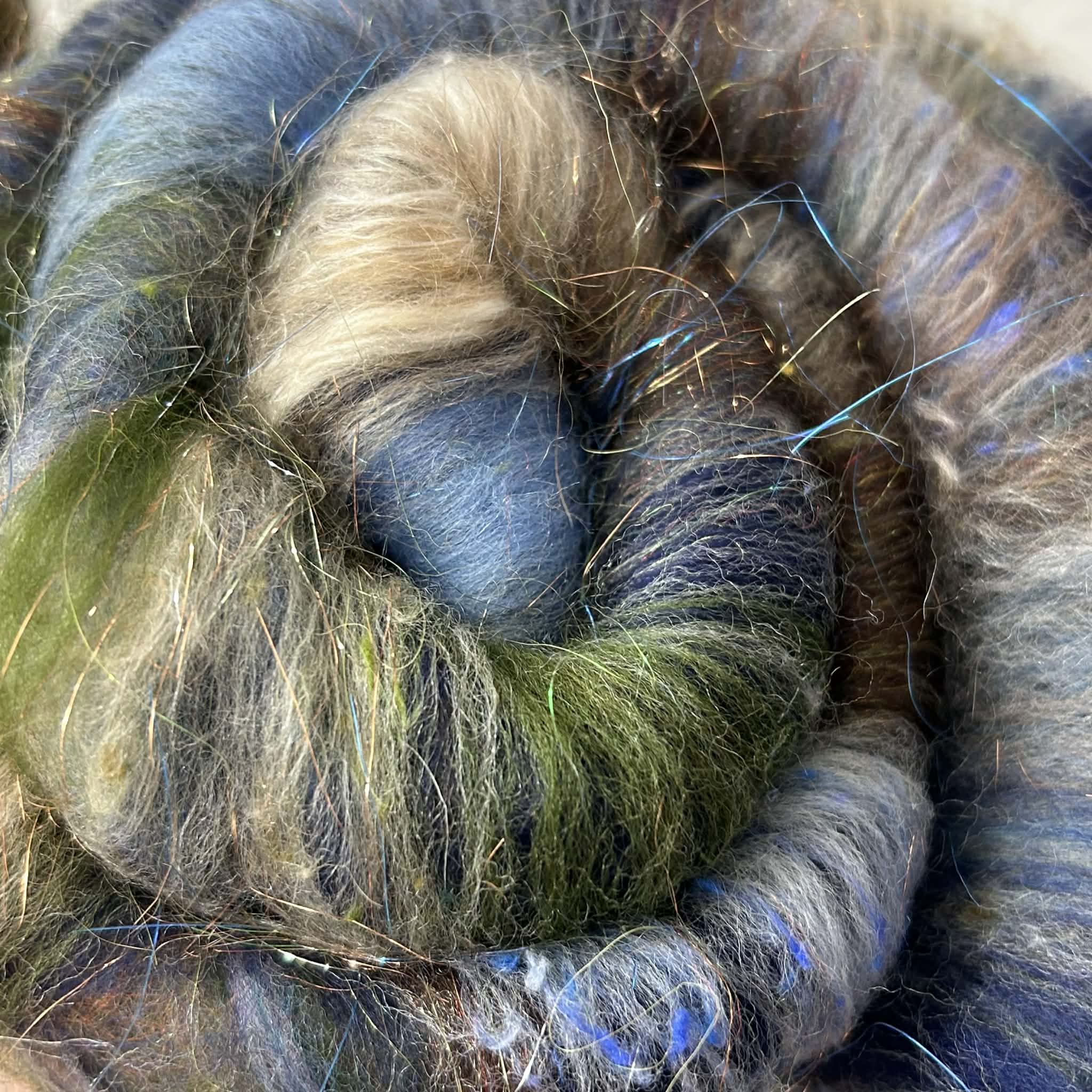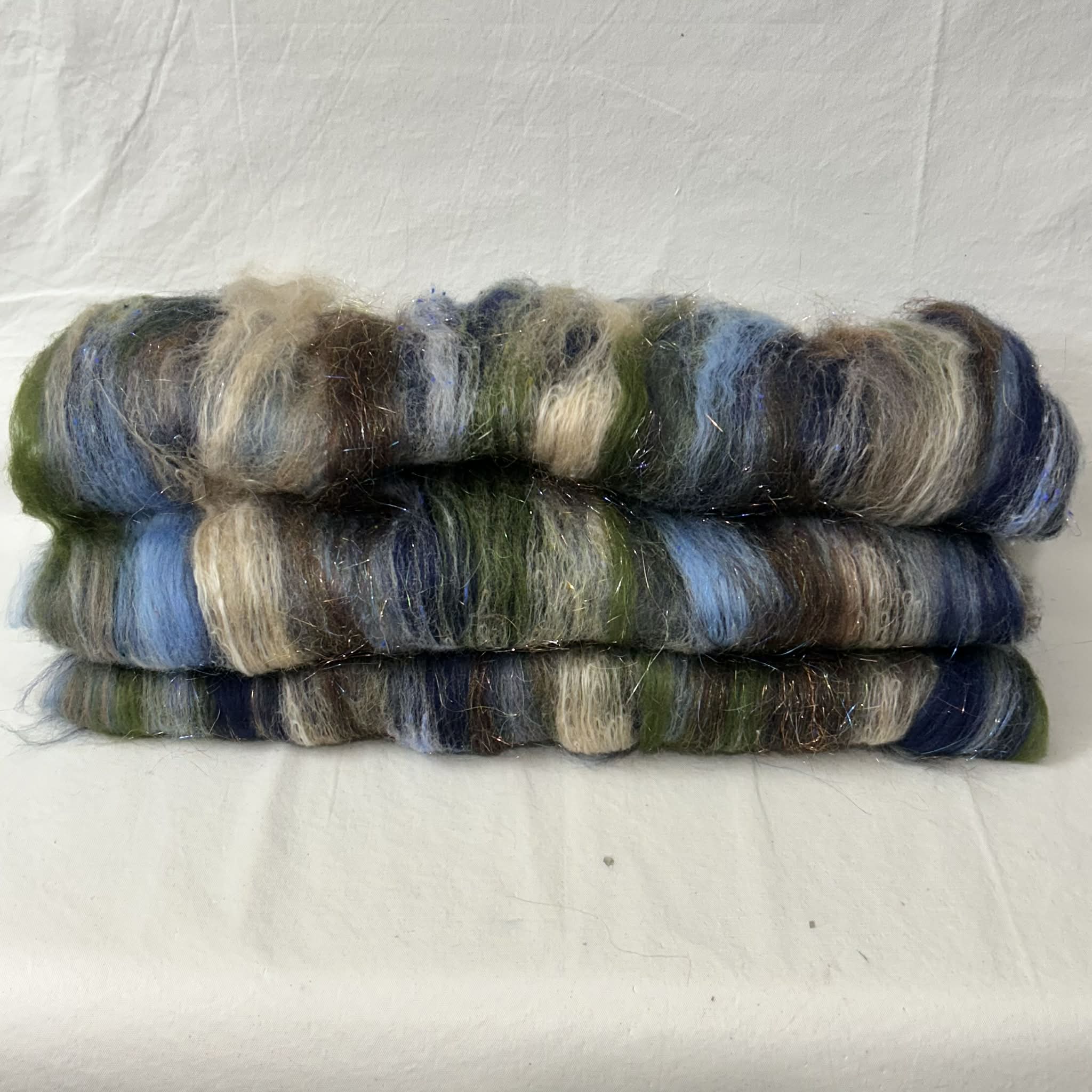Everything But the Kitchen Sink (EBTKS) Art Batts are made from premium and luxury fibers that may include silks, wools, bamboo, specialty fibers and more. The photo is the actual item you will receive. These are quality fibers and vibrant colors you’ll love to spin up. No VM. The EBTKS art batts won’t contain a list of exact fibers used as my other fiber art batts do. Please see photos.