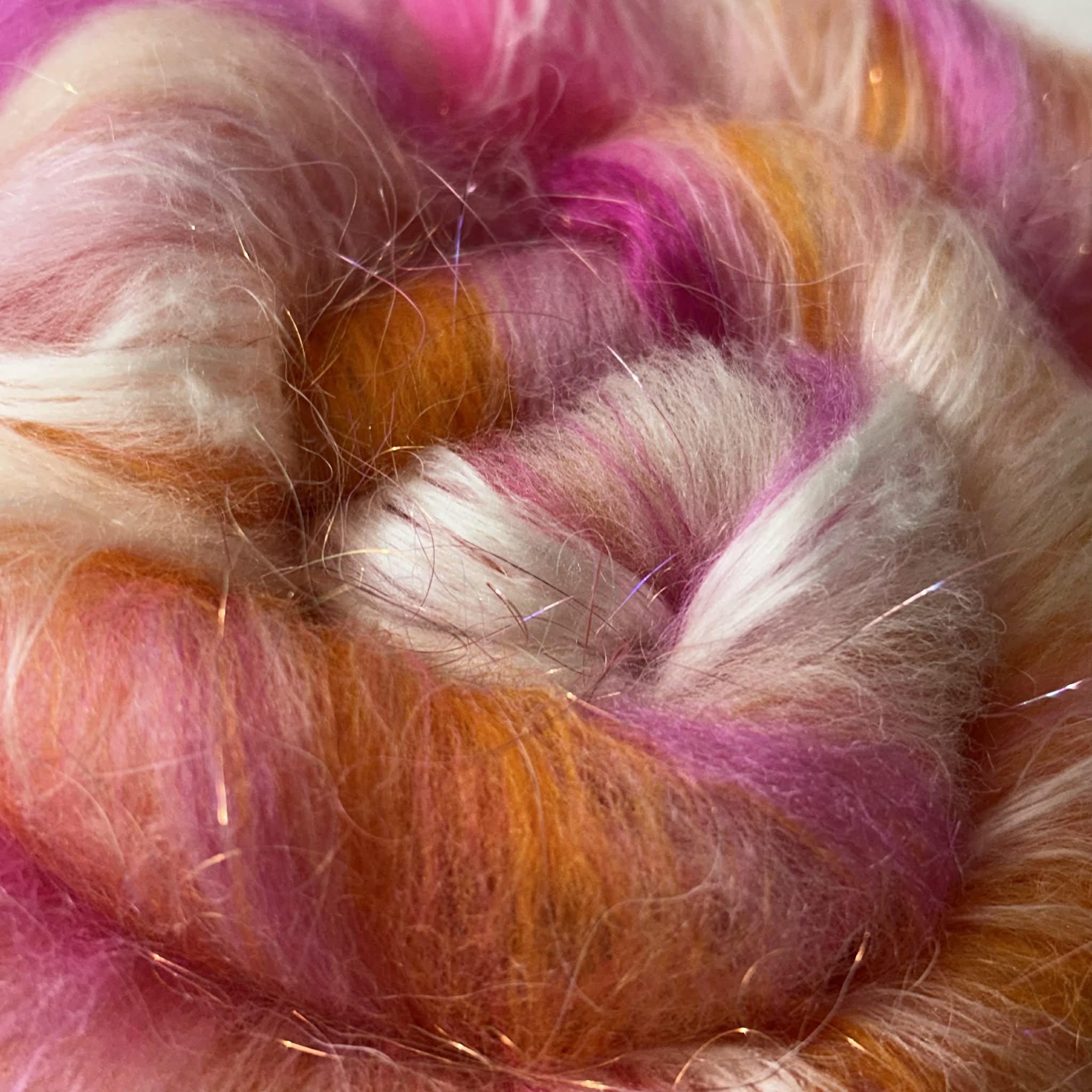 Everything But the Kitchen Sink (EBTKS) Art Batts are made from premium and luxury fibers that may include silks, wools, bamboo, specialty fibers and more. The photo is the actual item you will receive. These are quality fibers and vibrant colors you’ll love to spin up. No VM. The EBTKS art batts won’t contain a list of exact fibers used as my other fiber art batts do. Please see photos.